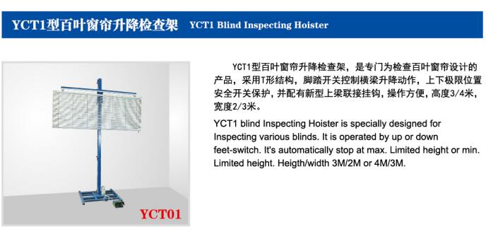 YCT1型百叶窗帘升降检查架是专门为检查百叶窗帘设计的产品,采用梯形结构,脚踏开关控制横梁升降动作,上下极限位置安全开关保护,并配有新型上梁连接挂钩,操作方便,高度3/4米,宽度2/3米.